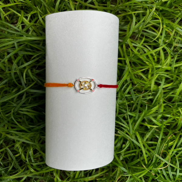 The two toned silver and gold rakhi is perfect for the devotee as well as offering the blessings and wisdom of Lord GANESHA to your brother. The central rakhi depicts swastik- symbolic of prosperity and good fortune. The moli colored thread adds to the beauty of this rakhi.