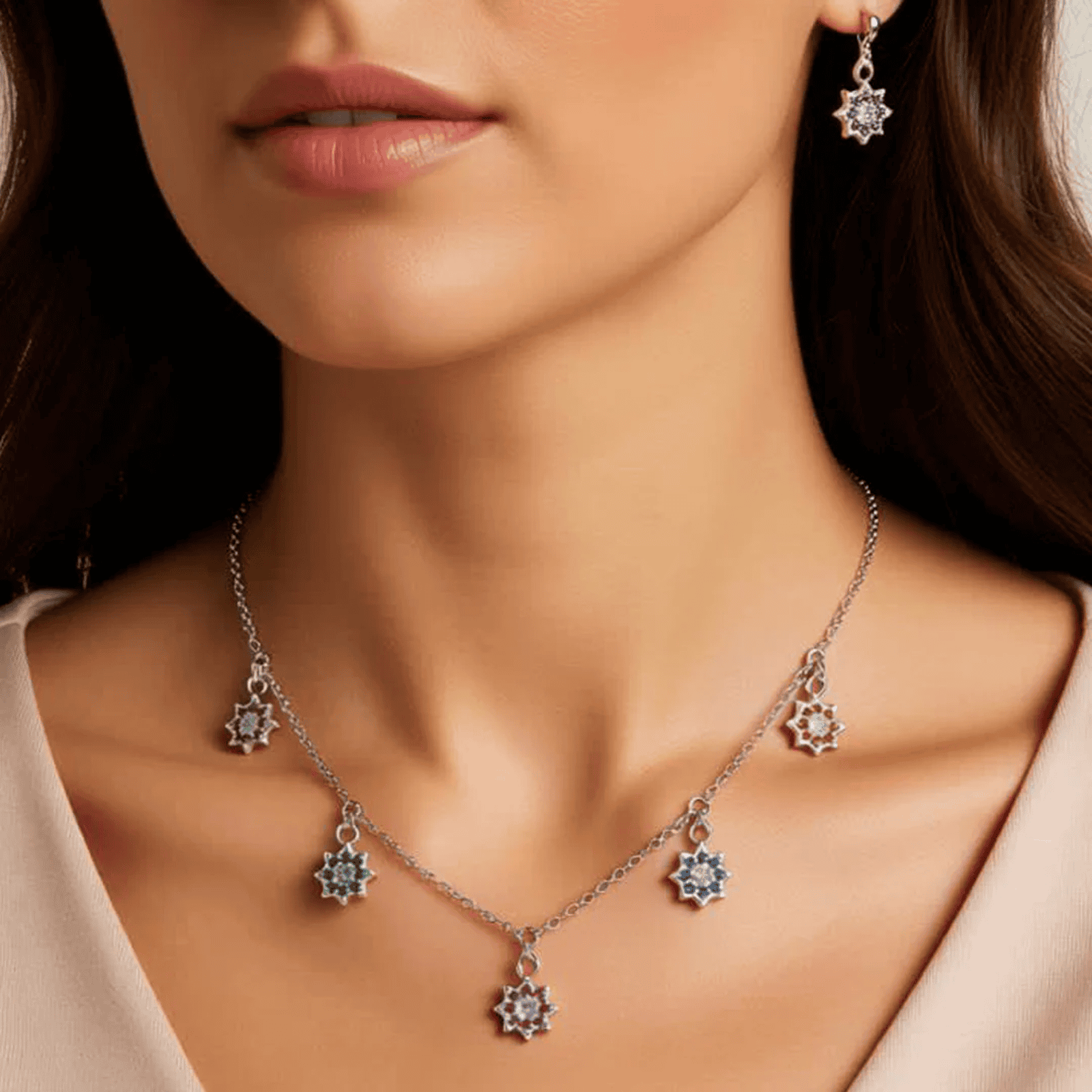 Blisse Allure Sterling Silver Multi Stone Studded Star Charms Necklace Set. This Necklace Set will add instant joy to your look! Featuring a stunning rainbow of colors, it's sure to light up your day. Indulge in a radiant accessory that'll bring all the sparkle to your style! Enjoy wearing it to the office or even when stepping out. 1. Stone - Cubic zirconia, WHITE,NANO, CITRINE,NANO GARNET,NANO GREEN,NANO RUBY,NANO SAPPHIRE 2.Colour - White, Yellow, Red, Green, Blue. 3. Closure - Spring Clasp Closure 4. Size - L- 406.4 mm , charms - 8 mm diameter, Earrings - L - 15 mm, W - 2 mm, D- 2 mm 5. Silver Purity - 92.5 Every effort has been made to accurately reproduce the look of this product but there might be slight variations in the colour and size of the actual product received due to on-screen representation. This jewel consists of Sterling Silver composition and comes with a '925' sterling silver stamp as a symbol of guaranteed product quality. All metals used are lead free, nickel free, and hypoallergenic. Non-allergic for your skin, Blisse Allure Jewellery is coated in a special anti-tarnish polish that preserves its lustre and shine for long.