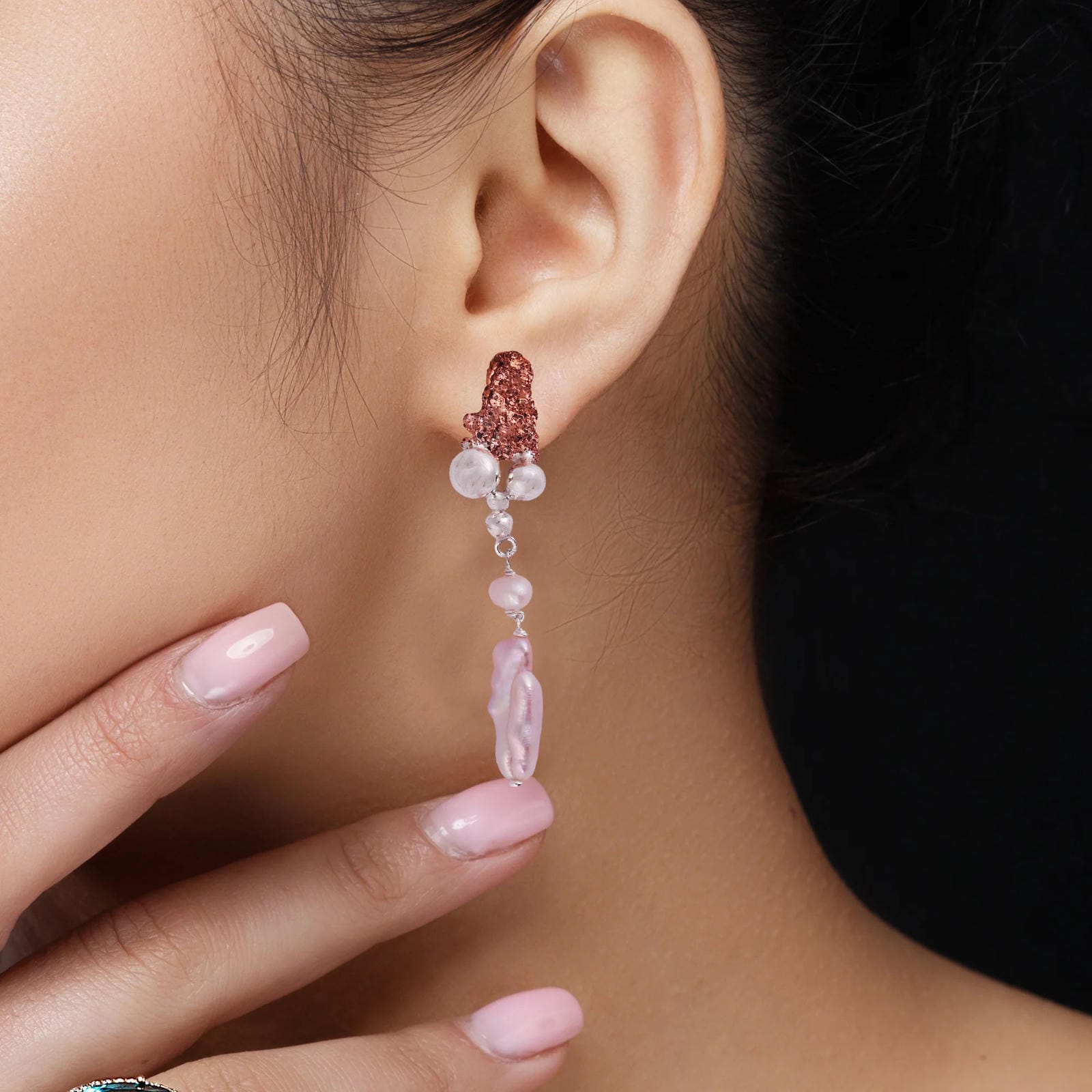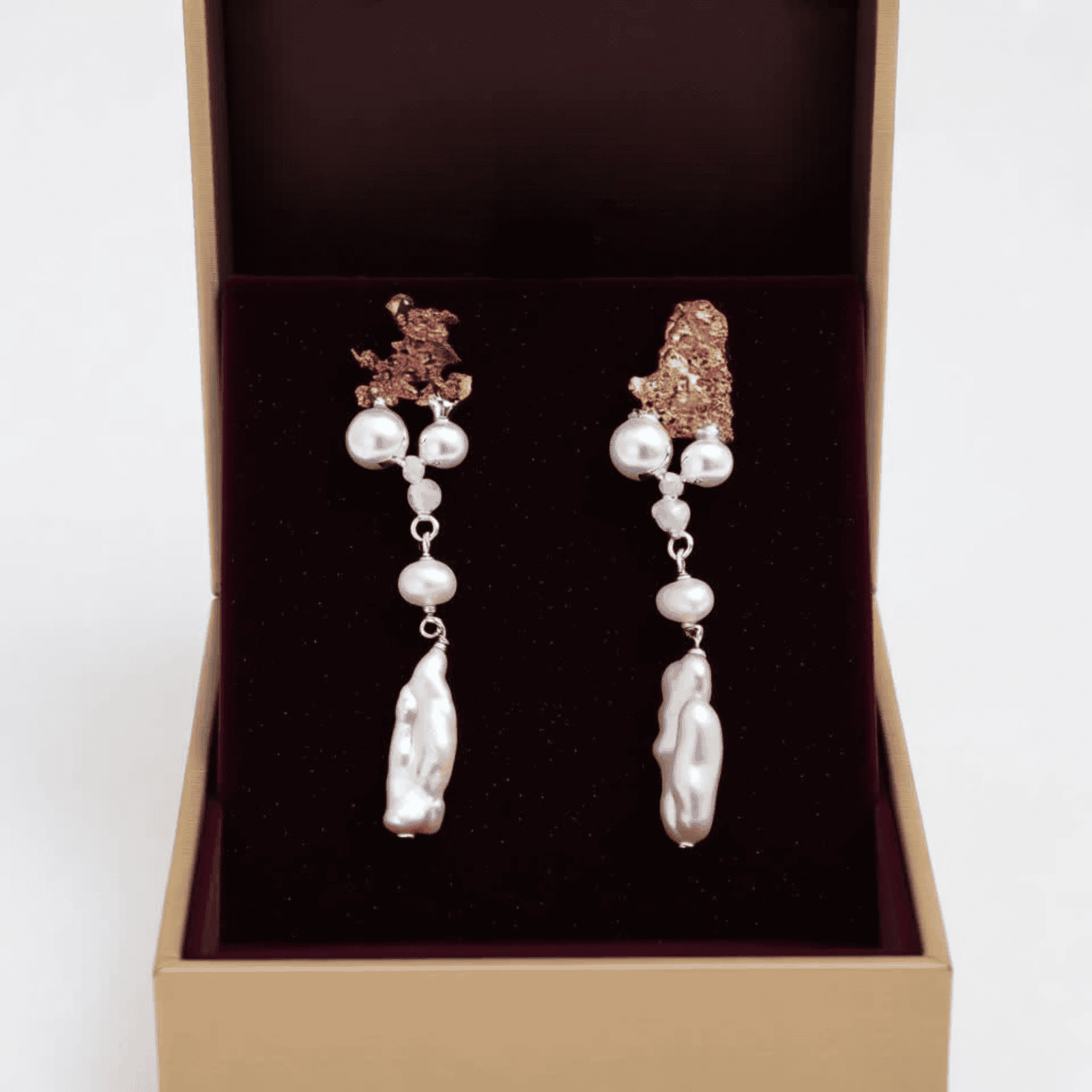 A striking blend of raw artistry and natural elegance — these earrings feature irregular copper polished tops paired with cascading baroque pearls. Each element is uniquely shaped, showcasing the organic textures of both metal and pearl. Set in silver, the design captures an earthy yet refined balance, perfect for those who appreciate handcrafted, contemporary jewellery with a natural edge.